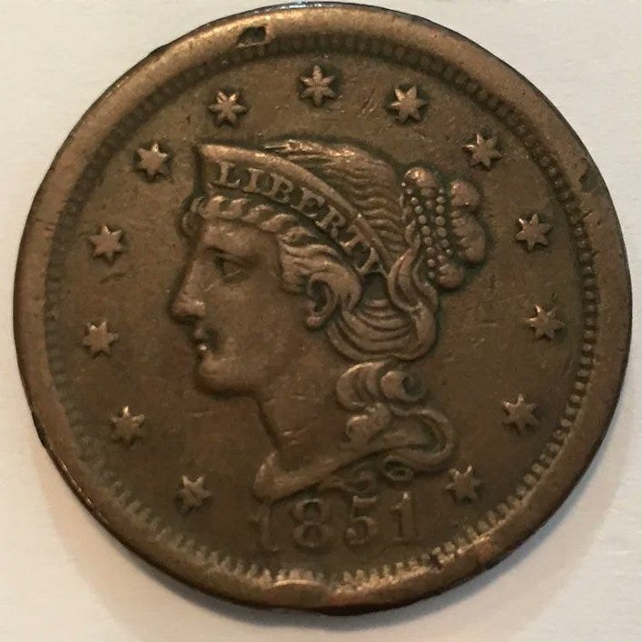 To me this story seems a bit far-fetched, evoking a similar air of sensationalism as other “Yellow Journalism” from the same period, as well as clearly being aimed at a pro-Union audience. However, the truth tends to have little bearing on angry sentiments, convinced minds, and roused emotions. Whether true or not, this designation was eventually accepted through an inversion of the meaning of their nickname, the “Copperheads” would adopt the Liberty Head Large Cent as the symbol of their movement. The Liberty Head Large Cent was an American Penny with the “American goddess” Liberty upon the face of the coin, wearing a headband with her name thereupon. It was from these pennies that “Liberty” would be cut from the cent and made into a pin.[8][9][10]